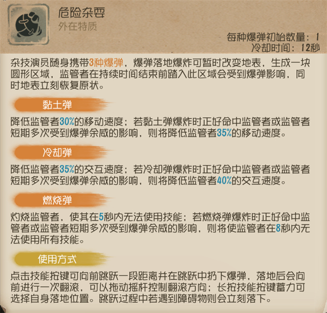 杂技演员每局最多可拥有6个爆弹,当爆弹消耗完之后不能更换成其他道具,所以要谨慎使用。切换爆弹时会有一个切换的动作,所以在切换爆弹时无法通过祭司的【门之钥】,在治疗队友的过程中切换爆弹会中断治疗过程,但是破译密码机或坐上狂欢之椅后切换爆弹不会有切换动作。