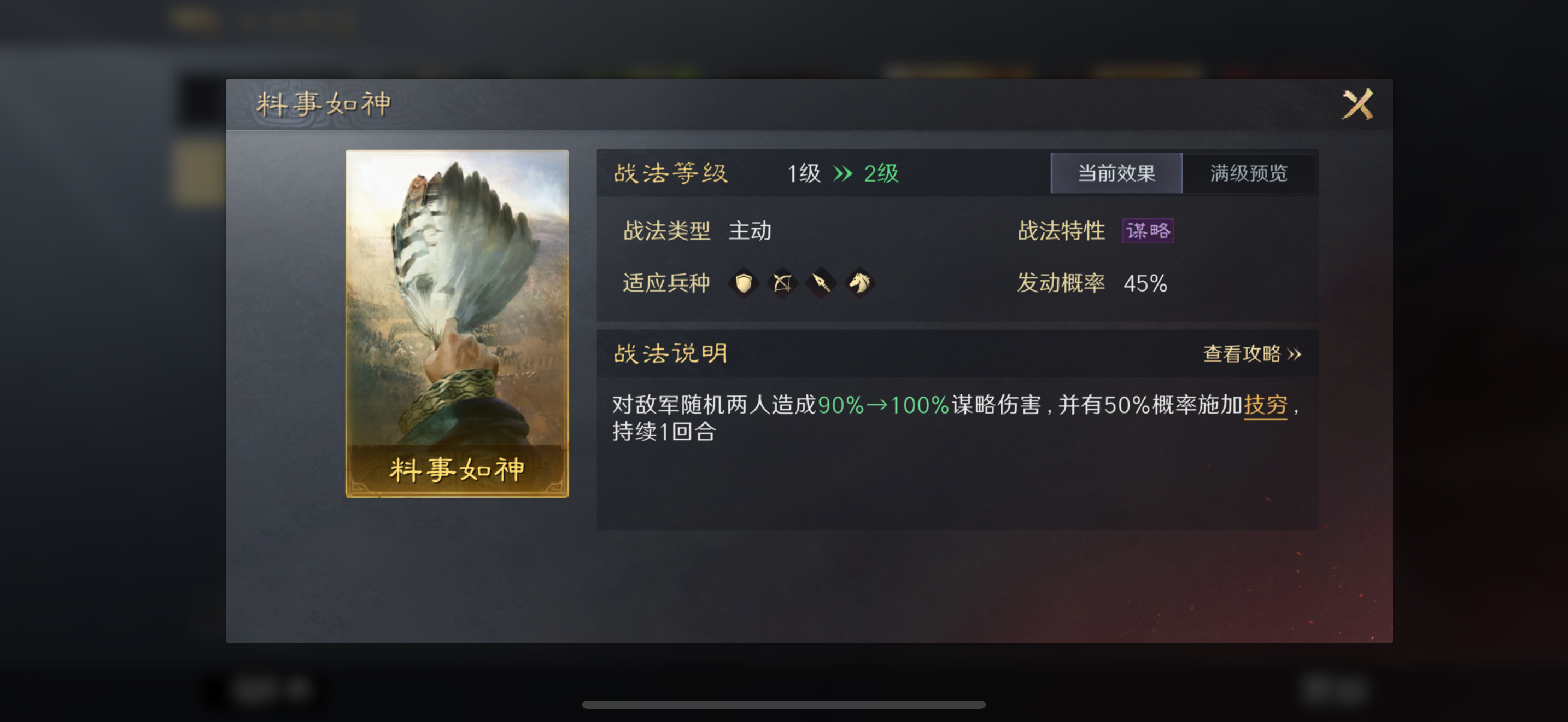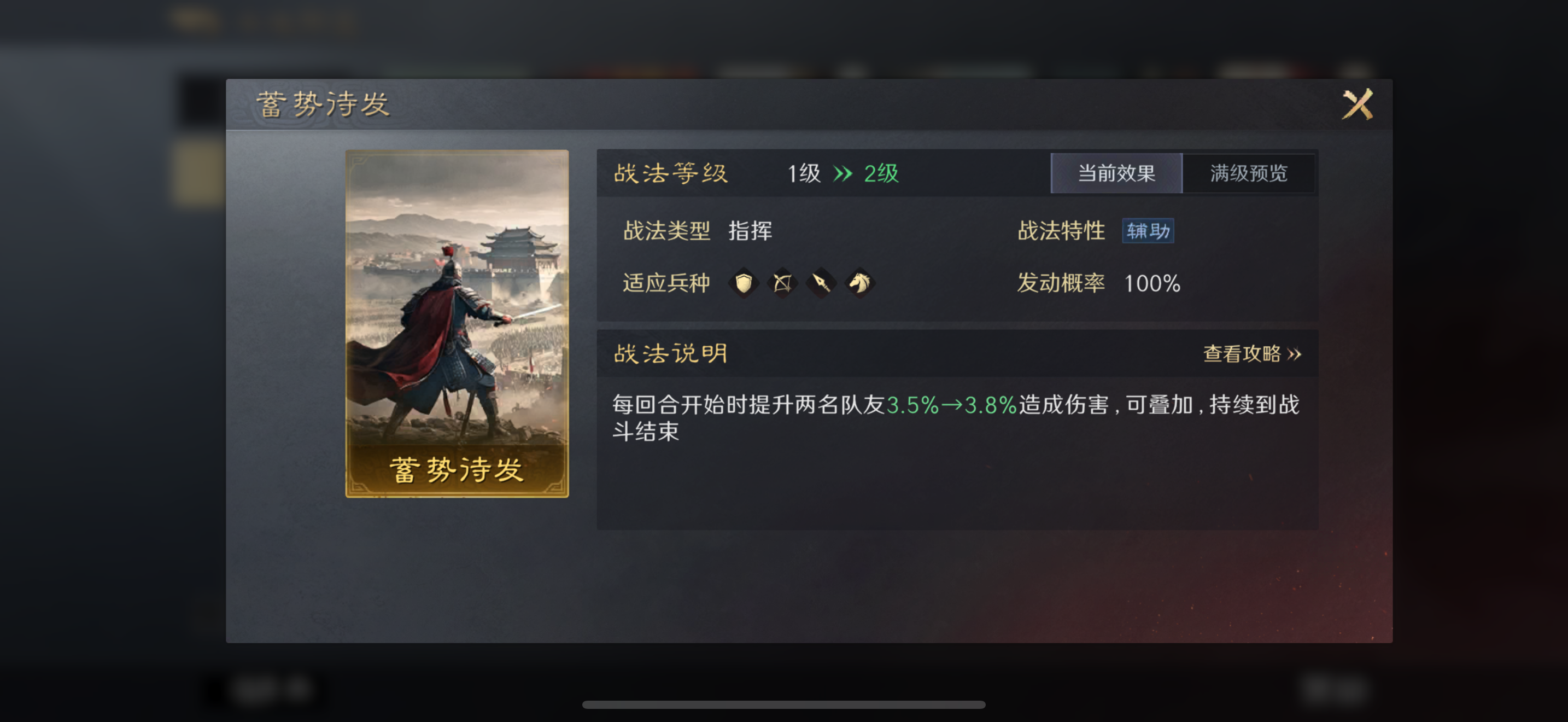 • 韬略选择:姜维可选蜀武兴略+文武兼资,提升智力与武力强化输出。演义袁绍可选择演义:邺城雄藩。神韬驭势·诸葛亮选择八阵,前几回合增加我军全体造成的伤害,后几回合降低受到的伤害。
