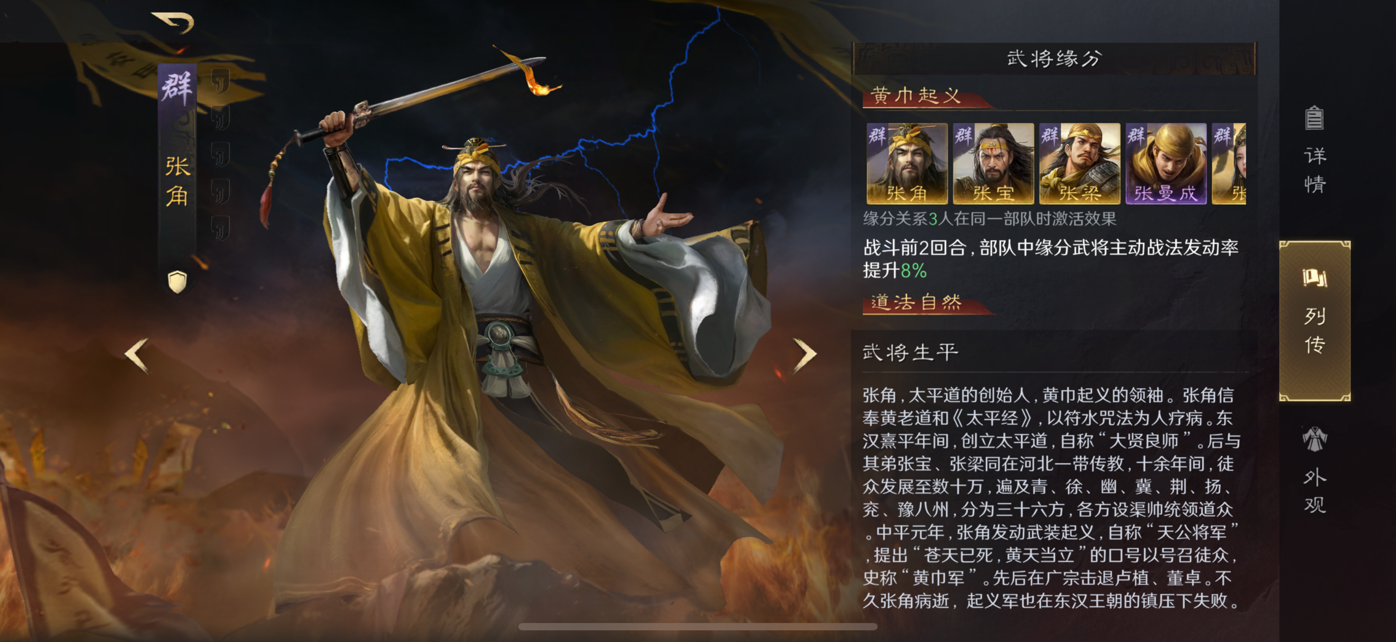 • 阵容思路:该阵容依靠“道法自然”缘分效果,战斗前3回合,部队中缘分武将发动准备战法时,有概率跳过1回合,可让张角的战法有概率快速释放。于吉在输出的同时打出缴械、技穷等控制效果,左慈提供减伤和回复,为张角创造良好输出环境,使其通过高伤害主动技能打出爆炸谋略输出。