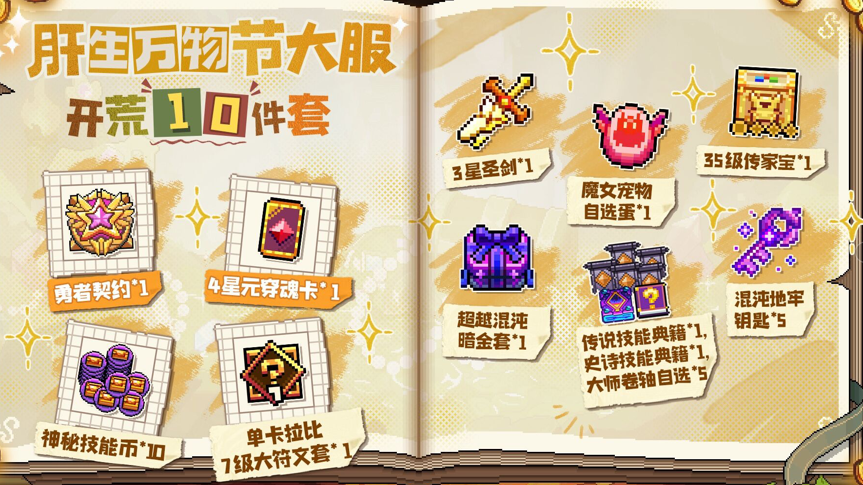 本次肝生万物节大服还有一个特殊福利:通关小秘境第10层,能拿一份勇者契约,这样每天资源本的头前2次都可以获得3倍资源,建议每天100体力刷5个资源副本,之后的体力去混沌地牢