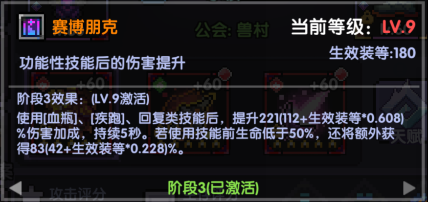 4层兽化的情况下,打完橙技能后,还会剩下1层兽化,在伤害够的情况下,合理安排普攻+紫技能 / 橙技能 的输出节奏会对提升成绩有所帮助。