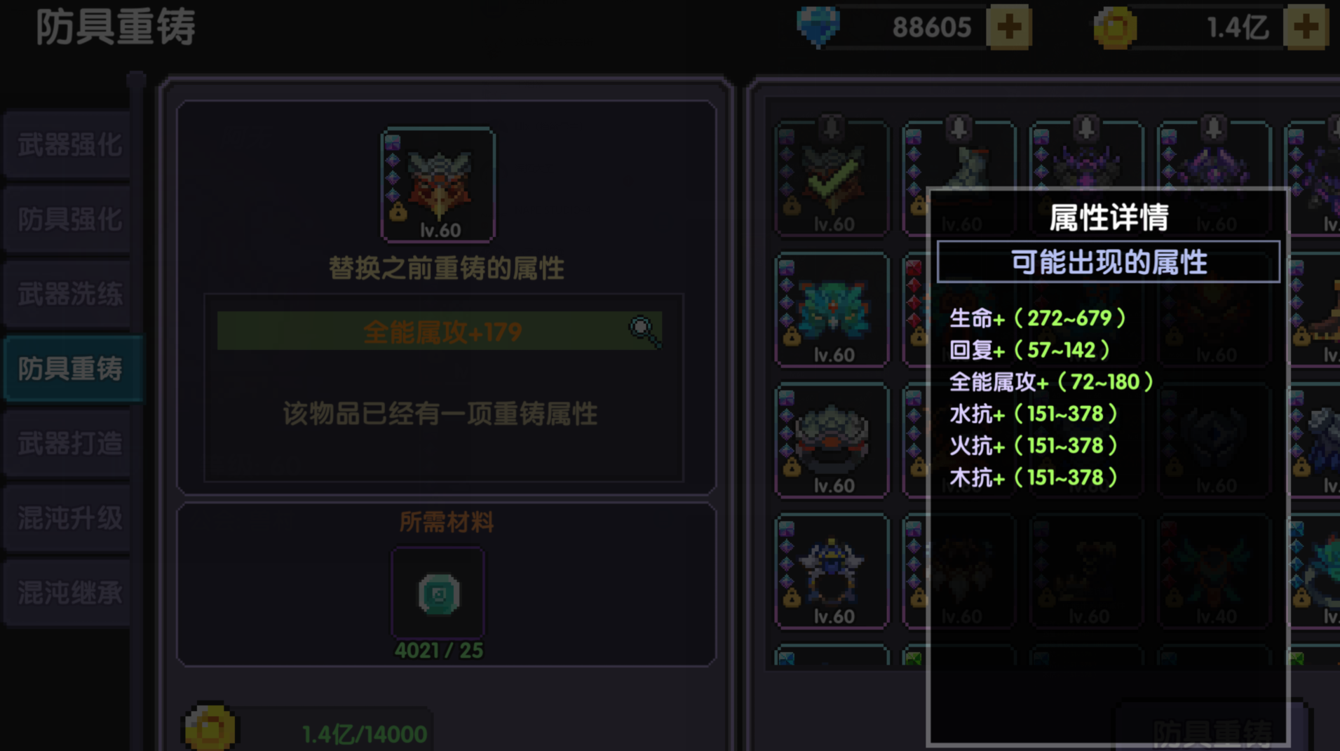 •防具的属性可以通过防具重铸来重铸某一个属性,通过铁匠铺 - 防具重铸来选择词条。