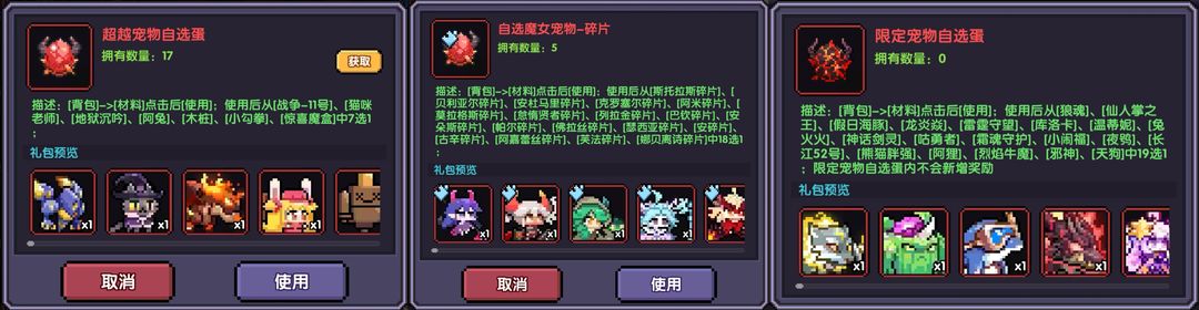 宠物的获取由易到难可分为三类,普通红宠、魔女宠、限定宠。(上图从左到右)