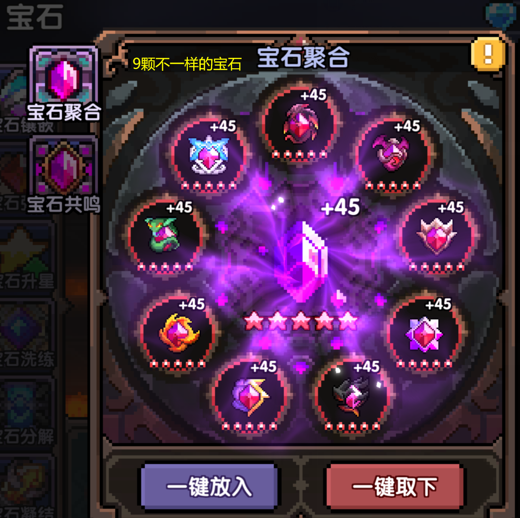 1.宝石聚合放入任意属性9颗【不一样】的宝石,并平均进行升级、升星。升级、升星方面只需要养这9颗宝石就可以。有条件的话,这9颗宝石可以挑选上述谈到的毕业宝石更佳。