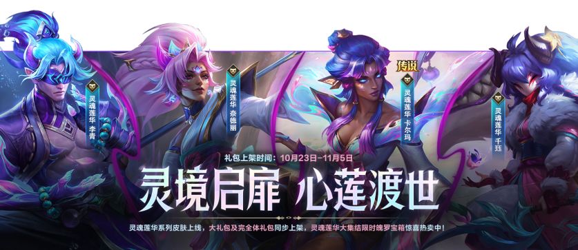 灵魂莲华 李青、灵魂莲华 奈德丽、灵魂莲华 卡尔玛、灵魂莲华 千珏今日登场!即日起至11月5日23:59,灵魂莲华夜樱绘卷大礼包及各皮肤完全体礼包限时上架,灵魂莲华大集结限时魄罗宝箱同步惊喜热卖。