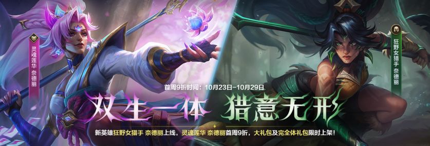 新英雄狂野女猎手 奈德丽今日上线,相伴而来的还有其伴生皮肤灵魂莲华 奈德丽!即日起至10月29日,首周享有9折优惠,召唤师可前往商城以800点券的价格拿下新皮肤~