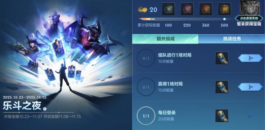 5、活动任务作为宝箱升级能量的来源,分为每日任务与挑战任务,召唤师完成登录、对局首胜、累计对局等任务即可累计能量值,能量值累计达到指定数值可将宝箱升级到对应品质。