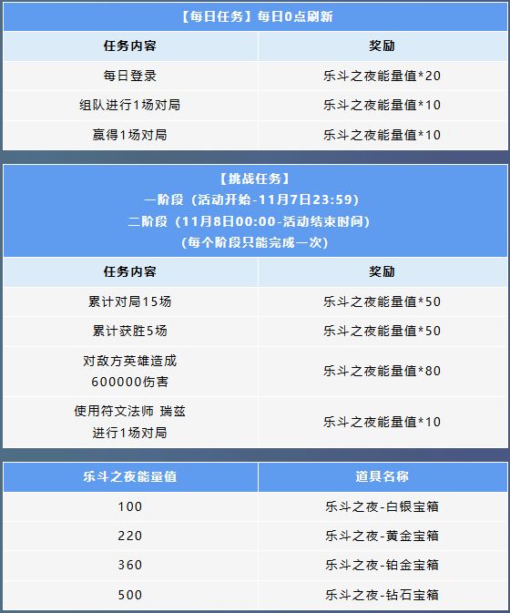 ⭐ “乐斗之夜”活动今日开启,召唤师完成任务即可提升宝箱品质,最高级别的宝箱为钻石宝箱,11月8日开启宝箱最高可获得随机1款史诗皮肤!