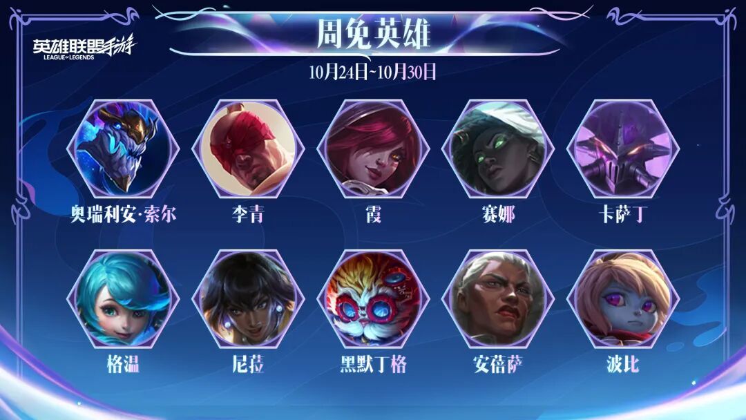 新一轮周免英雄将于10月24日(明日)开启!李青、安蓓萨、霞等人气英雄名列其中,召唤师们快携手心仪的英雄在新版本中大展身手吧~