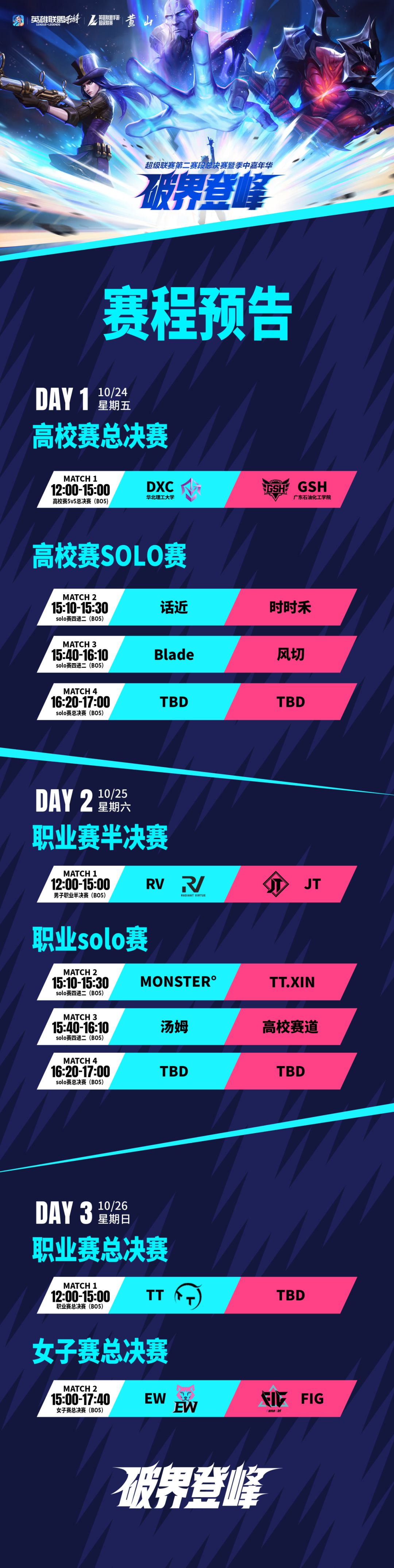 明日,巅峰对决!《英雄联盟手游》超级联赛第二赛段——高校联赛决赛、SOLO赛道决赛、女子赛道决赛以及5V5职业赛道决赛,四大赛道汇聚黄山云海,让我们共同见证冠军的诞生!舞台已准备就绪,召唤师快下滑查看完整赛程预告,精彩决赛不容错过~
