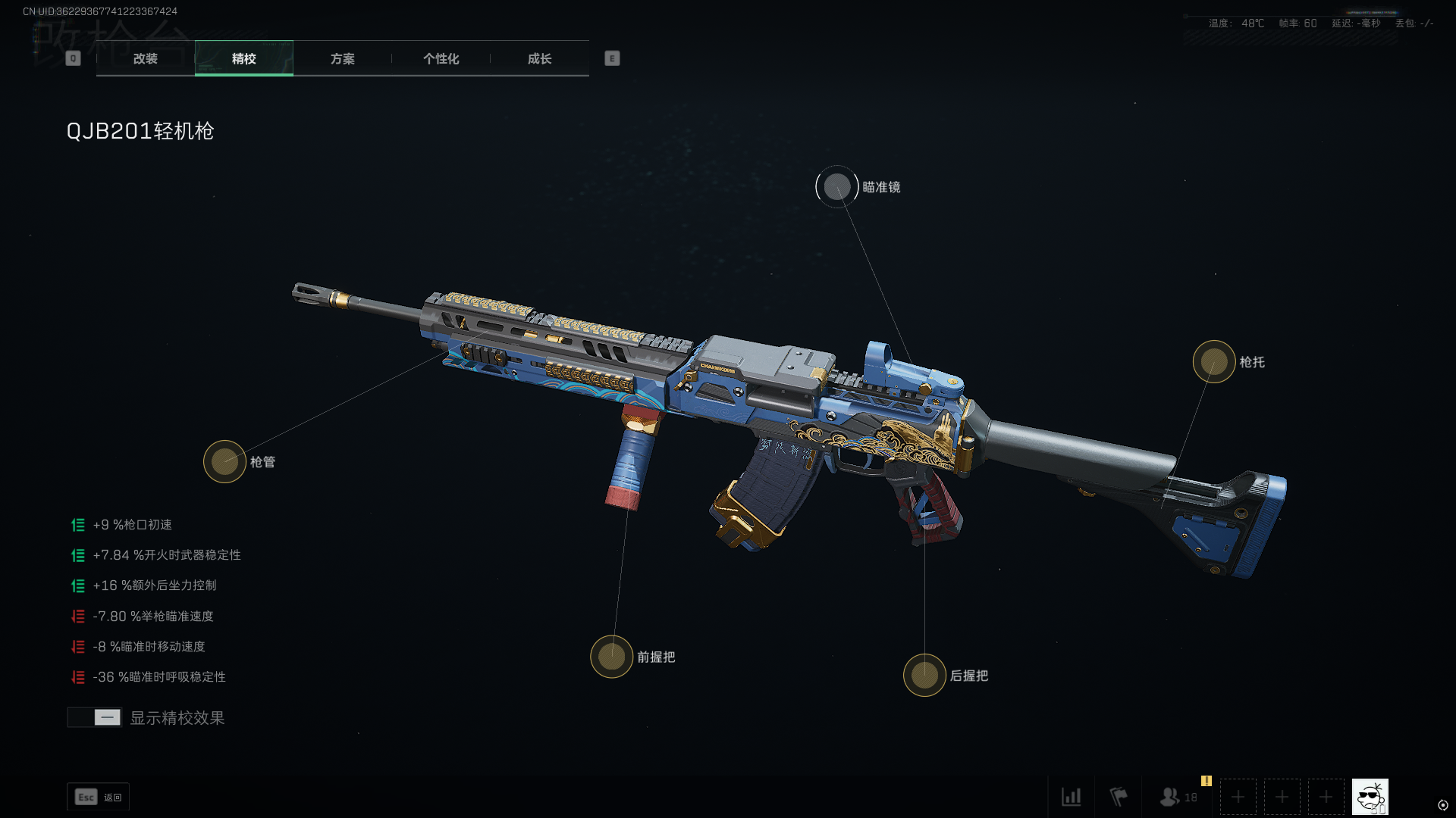 这套方案的精妙之处在于精校,如图所示,我们总共可以通过精校获得16%额外后坐力控制,以及近8%开火时武器稳定性。这些精校属性进一步提高了QJB201架枪时的稳定输出能力。