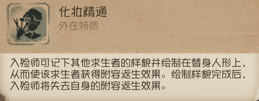 ③ 此特质是入殓师辅助的核心特质,如果队友被监管者追击时经过我们附近,并且被记下了样貌,可以考虑为其绘制替身人形,以此来减轻救人位的压力。