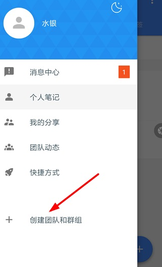 4、通过左上角按钮打开个人功能列表,我们还可以创建团队或群组,在其中分享自己的笔记文件,避免发生数据丢失的情况。