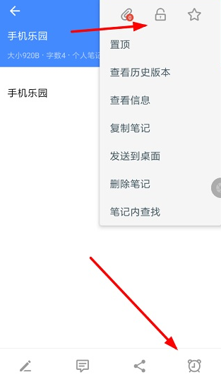 3、成功保存笔记内容之后,再次点击查看笔记内容,用户可以通过右上角按钮唤起功能列表,或者使用底端的菜单里的各项服务。