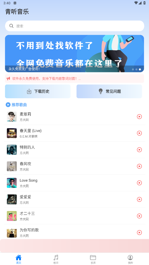 青听音乐旨在为用户提供高质量的音乐体验。它拥有丰富的曲库,涵盖流行、摇滚、电子、经典等多种音乐类型,满足不同用户的听歌需求。青听音乐的界面简洁、直观,用户可以方便地搜索、播放和创建个人化的播放列表。除此之外,青听还支持离线下载,让用户随时随地都能畅享音乐。其智能推荐功能,根据用户的听歌历史提供个性化的歌曲推荐,提升音乐体验。