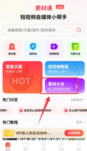 3.登录后进入首页,点击素材大全选项查看资源内容。