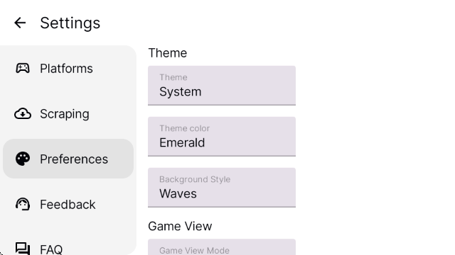 3、可进入设置页面,进行主题颜色、背景风格、游戏视图模式等个性化设置。