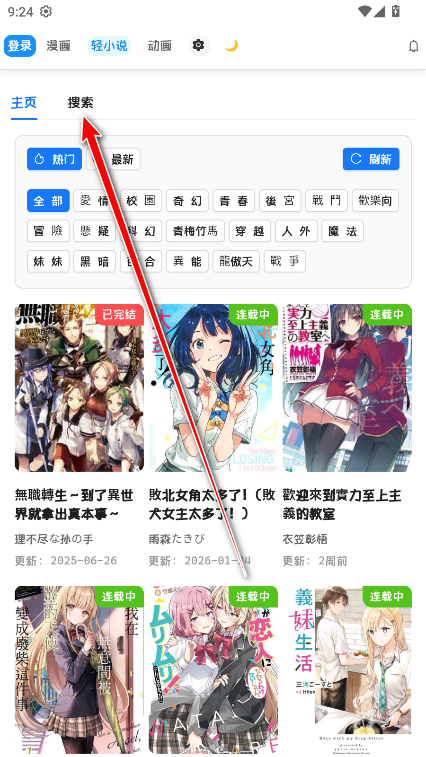 1.打开doki,可以看到首页有很多类型的资源板块内容,比如有漫画、轻小说、动画等,点击搜索。
