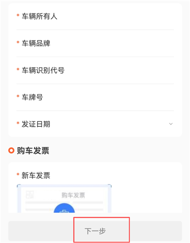 5、上传行驶证、新车发票,并填写车辆所有人、品牌等信息,点击【下一步】进行绑定。