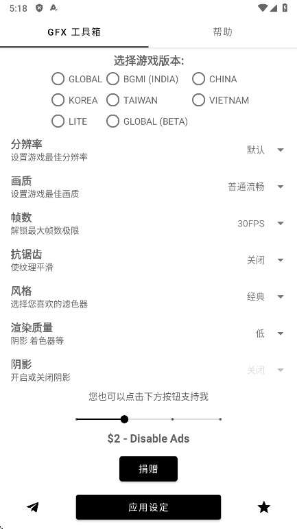 5、此外在GFX工具箱内还可以设置抗锯齿、阴影、纹理等多种数据修改,在设置完成后,点击底部“应用设定”既可开始体验啦!