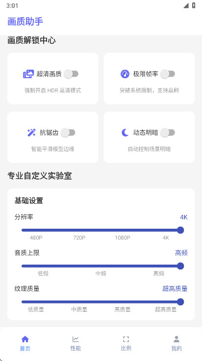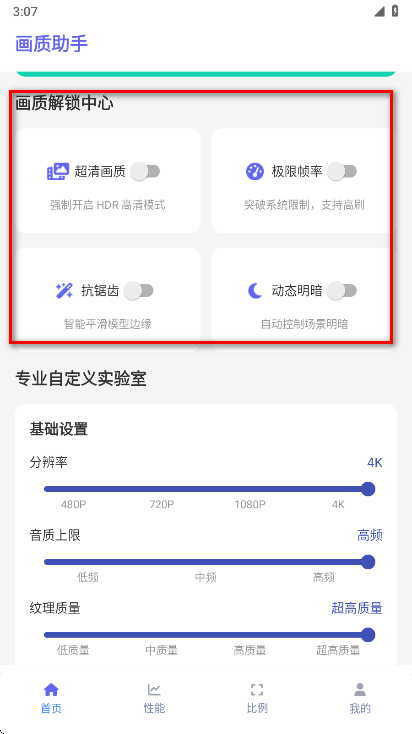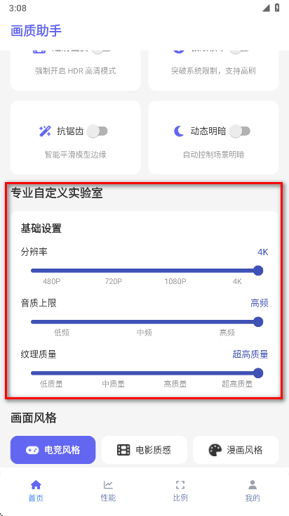 3.专业自定义实验室板块,大家可以自由左右滑动来调节分辨率、音质上限、纹理质量等功能。