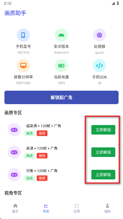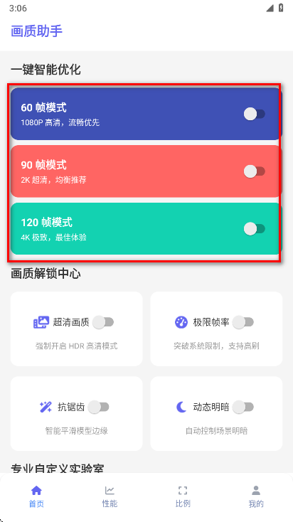 2.画质解锁中心板块,也有四个功能可以选择使用哈。