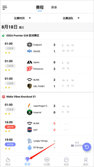 1、进入软件后,点击下方【赛事】可以看到各种时间段的赛事;