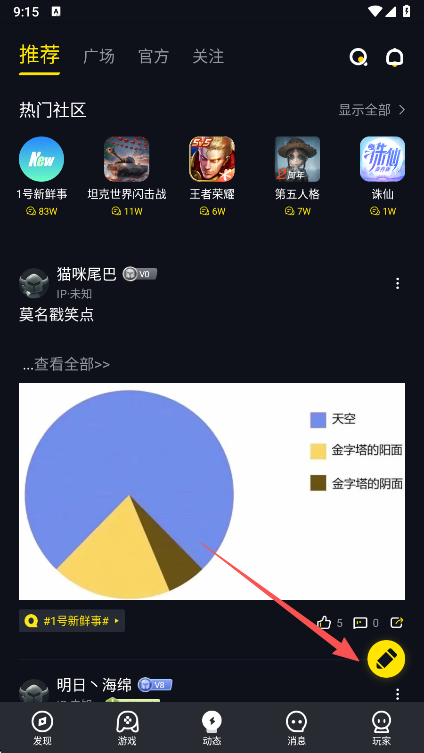 1、在1号玩家app中是提供了动态社区,用户可以来到动态社区,点击右下角的发帖按钮