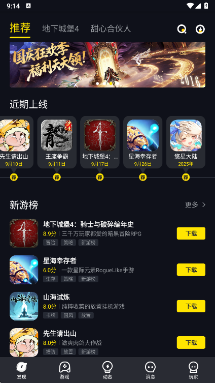 1、在本站下载安装1号玩家app打开,来到发现页可以获取到推荐游戏