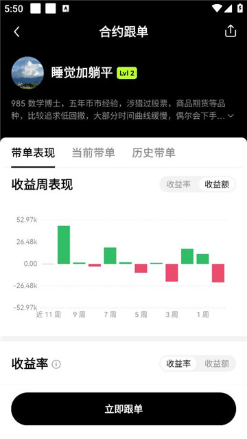 2, 在交易员页面,点击头像查看带单详情,或选择【立即跟单】进入【跟单设置】,,填入【单笔跟单金额】和【最大跟单金额】信息,点击【立即跟单】。但是当您有合约持仓和合约交易时,需要先平仓和取消订单,才能成功跟单。