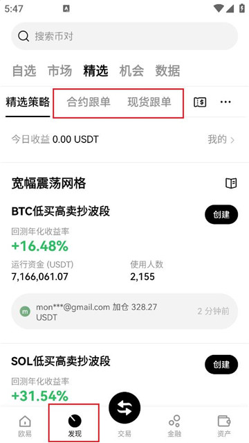 1,首页选择【发现】,顶部选择【跟单】,可在【跟单广场】看到带单交易员的收益率。选择【综合排序】,可按照不同的方式进行排序,选择你要跟单的交易员,点击【跟单】。