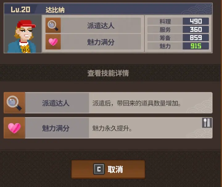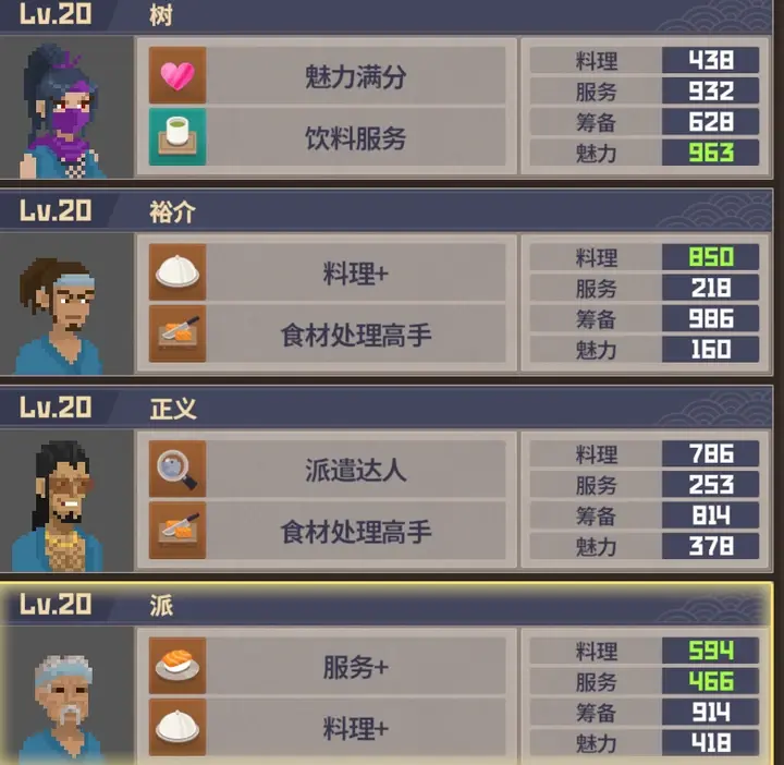 除去主副店的九名员工按理说剩下的12人都是派遣人员之一,其他属性比较差的我只给了15级解锁全技能和菜谱,像是查理这种筹备和魅力双低的拉20的必要性也不大。