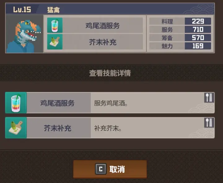 自带的鸡尾酒和清理服务技能在前中期没有解锁分店的时候,当做主店主力服务员使用,过渡很丝滑。