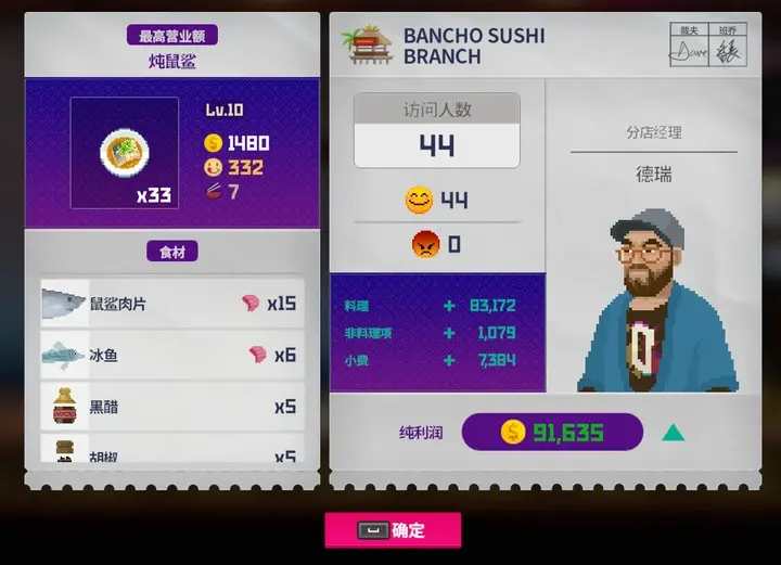 1.主店因为有戴夫充当大堂经理,所以只需要再额外雇佣四人,这里推荐厨房用詹姆斯+拉乌尔,大堂推荐凯因+埃尔尼诺,也就是我们说的牛战士,这个配置下我们只需要做一件事那就是补充芥末,这样基本可以保证每晚都能满评分,满顾客数。