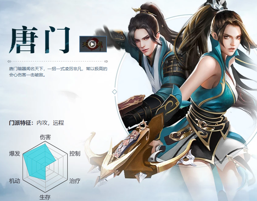 2.唐门:远程爆发,玩过游戏的少侠都知道,手游远程门派比较吃香。唐门可以说是策划的亲儿子了,在三招之内可以打败对方,让对手没有还手之力,即使你带的是自赏,也没有出招的可能。