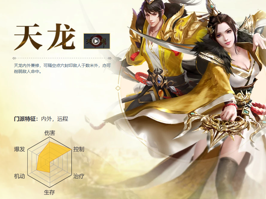 先带大家了解一下天龙派的基本情况。天龙是全属性、内外攻双修、远程类型的经典门派,驻地为天龙寺,武器为环,绝学是六脉神剑。中原武林称之为“天龙”,位十二大门派之列。