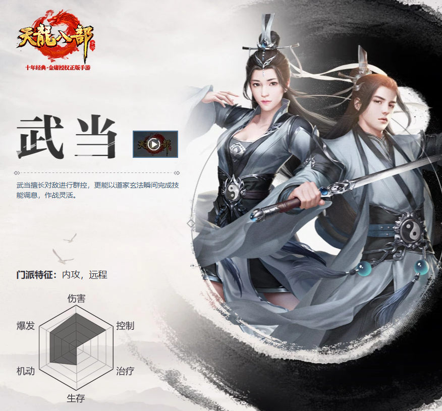 4.武当:高输出的远程打手,武当派在前期实力比较一般,不过也不算很弱,组队副本至少不会被排挤。后期武当在有无崖子之后,团战、副本输出都会大幅提升,团战输出第一、兵圣伤害第一轻而易举。