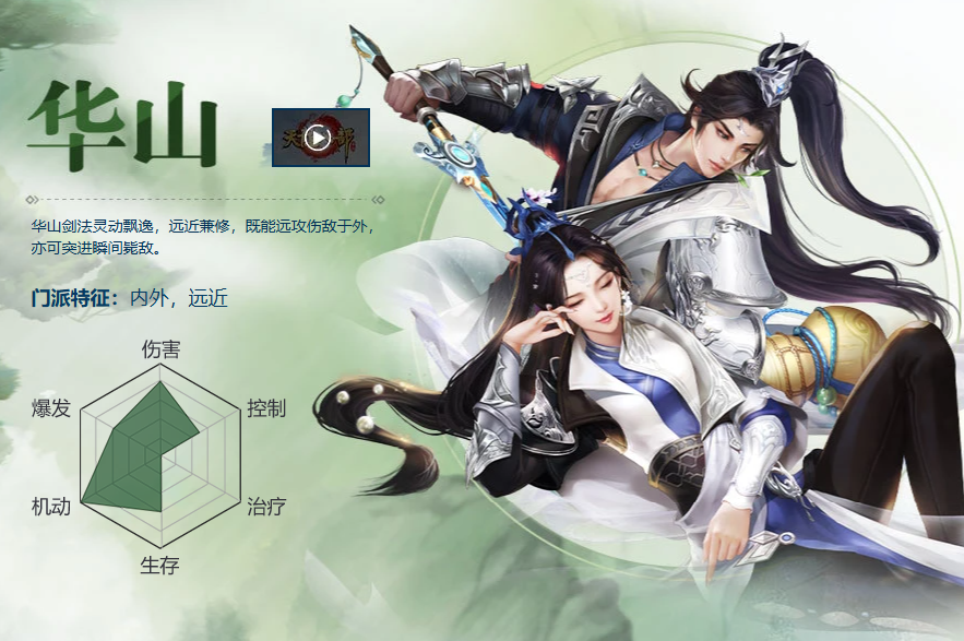 3.华山:华山在输出方式上是中远距离的,和武当这类纯远程的职业来比,输出距离上要差一些,但是在输出能力上,也算是顶尖的存在了。并且华山并不是特别依赖氪金,没有乔峰也一样能玩,只要能利用技能机制就能打出不错的输出。