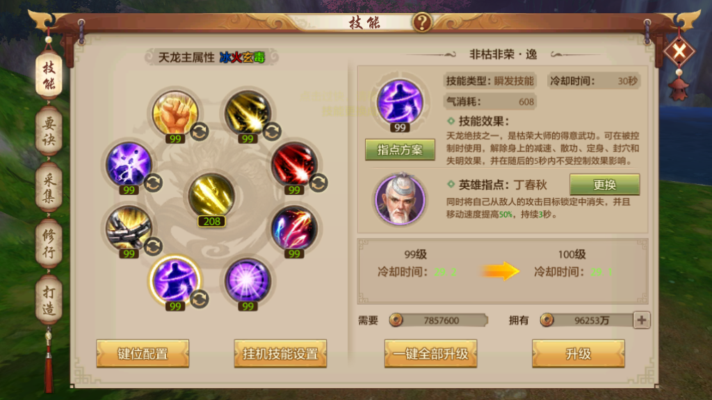 这一技能的出现让天龙重新回到了大众的视野里,可在被控制使用,能解除身上的减速、散功、定身、封穴和失明效果,并在随后5s内不受控制效果影响。丁春秋指点可以使移动速度提高50%,更能让天龙可以将自己从敌人的目标锁定中消失,有了近似隐身的强大保命能力!