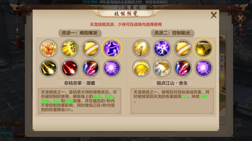 2.在瞬息万变的战场中,流派一的非枯非荣可以为自身提供免控、移速,大大提高了自保能力。相对于流派二的指点江山放大,更适于混乱的战场。这可是天龙的门派乱斗,一到了中间的位置,你就会面对铺天盖地的封印技能,还是小心为妙。综上所述,我个人更推荐玩家在天龙门派的乱斗活动中选择流派一的玩法。