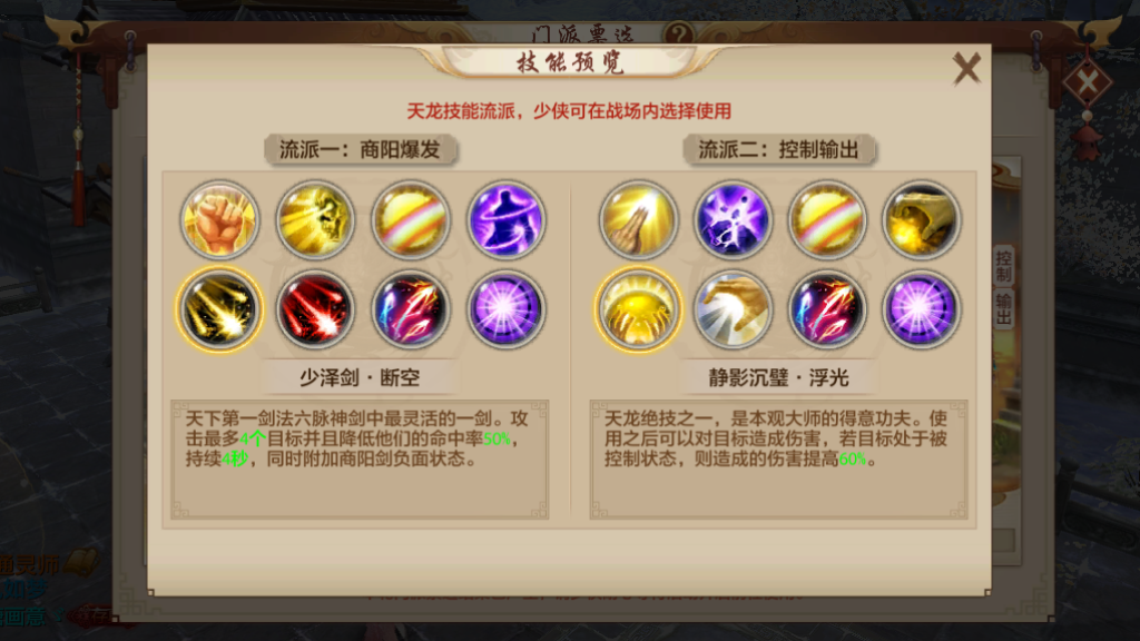 以上方三个最具代表性的技能为例,天龙在同门乱动活动中分为两种流派,一种是商阳爆发,一种是控制输出。其中我更推荐第一种流派:商阳爆发,主要是基于以下两个原因: