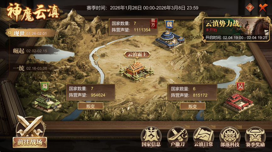 全新神魔云滇赛季火热开启,跨服大战一触即发。云滇大地上,魏、蜀、吴三大阵营势力各占一隅,风起云滇,群雄并起,各国为了争夺“云滇霸主”将会书写出怎样的战争新篇章,让我们拭目以待!