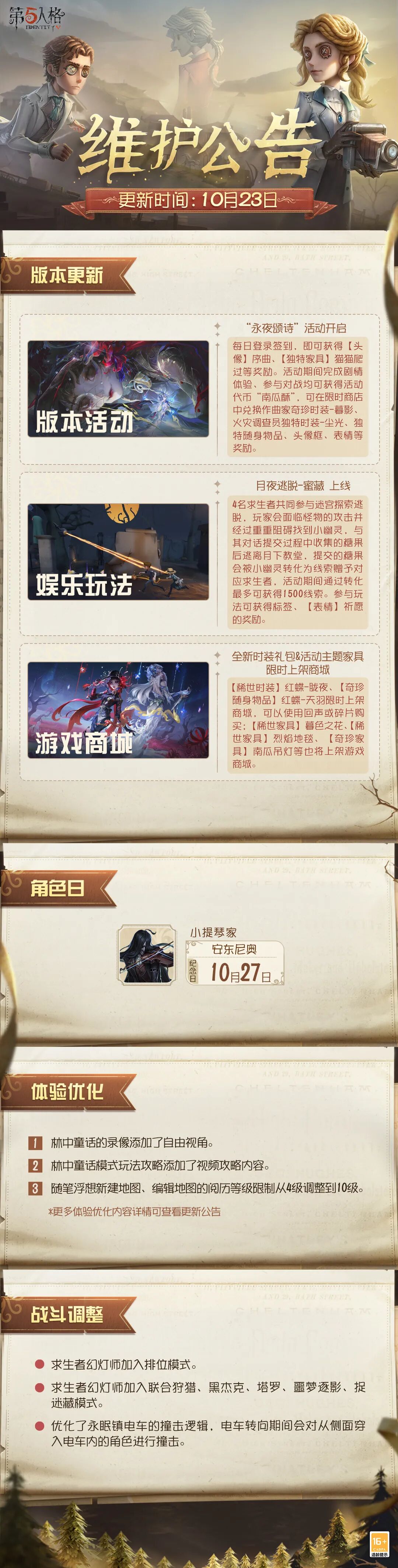 本周维护时间为2025年10月23日07:30,预计维护2小时,届时庄园将会暂时无法进入;
