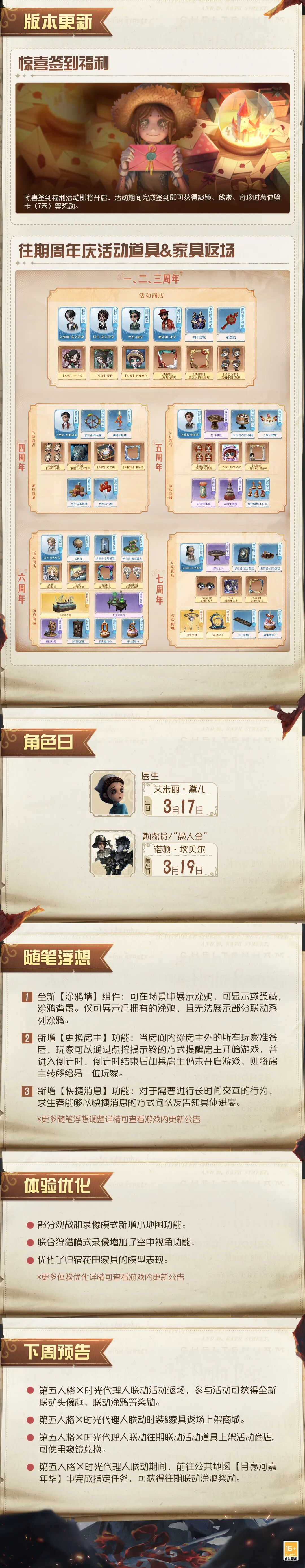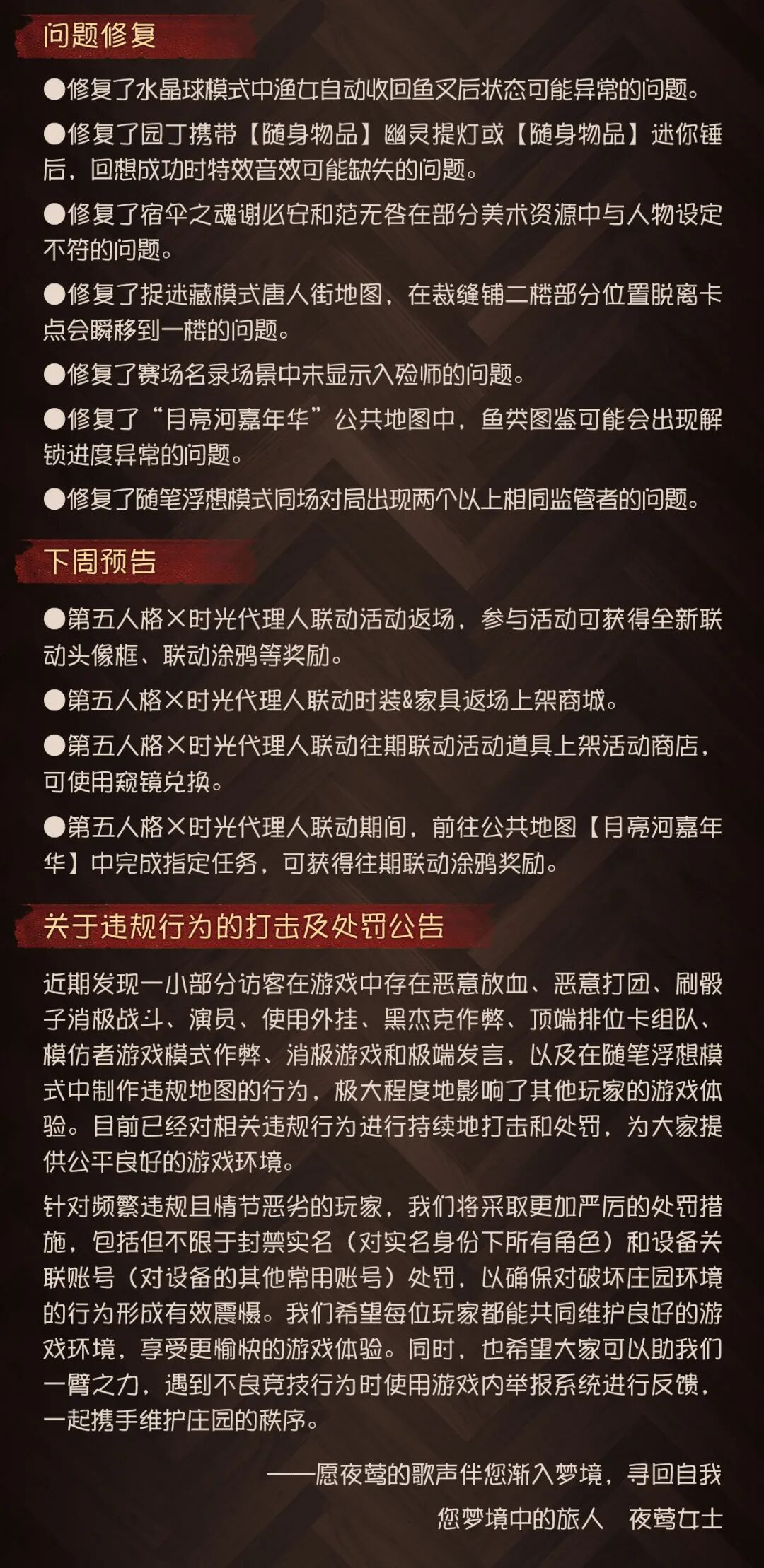 为保证庄园的稳定运行,【第五人格】将于周四上午07:30进行不停服维护。