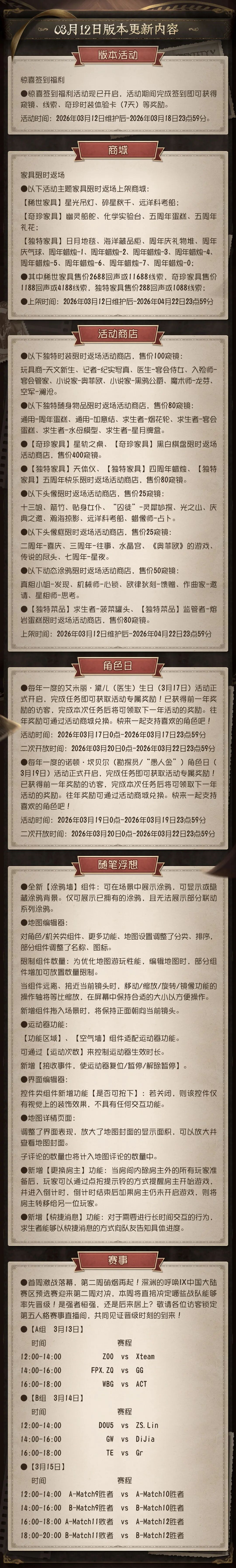 本周将采用不停服维护方式。7点30分服务器进入不停服维护状态,届时各位访客依旧可以体验大部分玩法和功能,包括但不限于:匹配、自定义、活动、推理之径等,商城的物品可以正常购买;