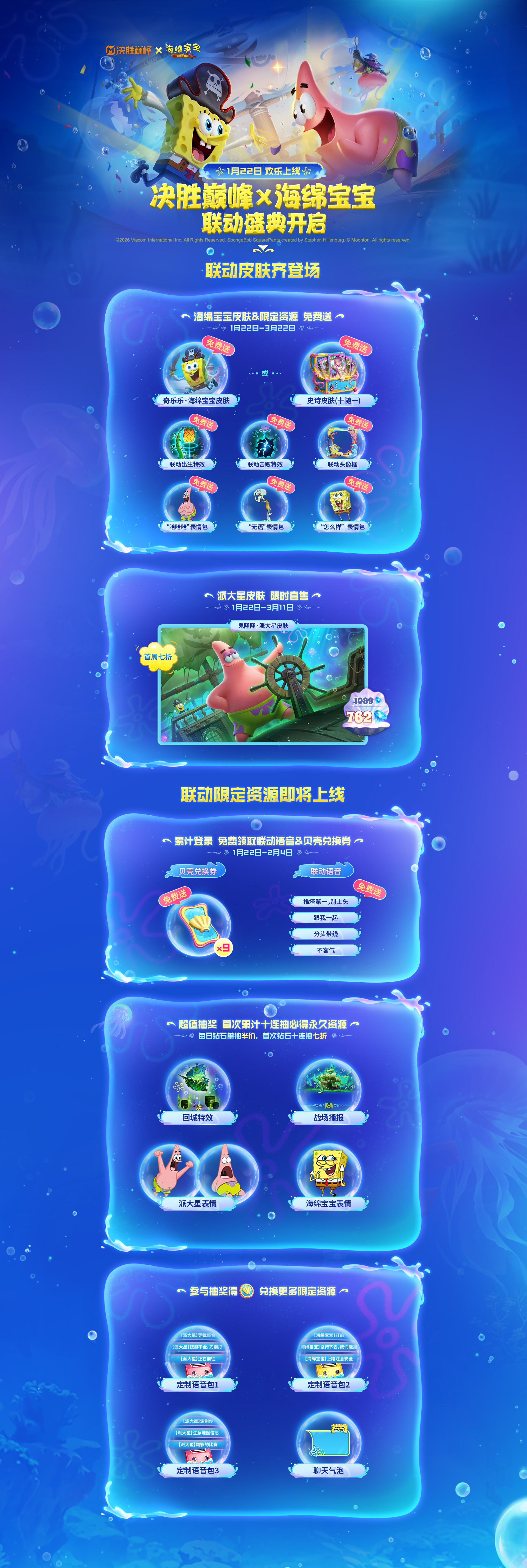 海绵宝宝与派大星联动皮肤即将上线,参与海底餐厅活动免费得海绵宝宝联动皮肤,更有联动回程、表情、出生特效等