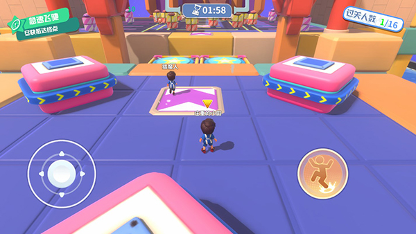 5、在进入地图闯关后,玩家可以通过左边轮盘控制人物移动,右边按钮控制人物跳跃,游戏每次都有三个小关卡,活到最后的人才能胜利。