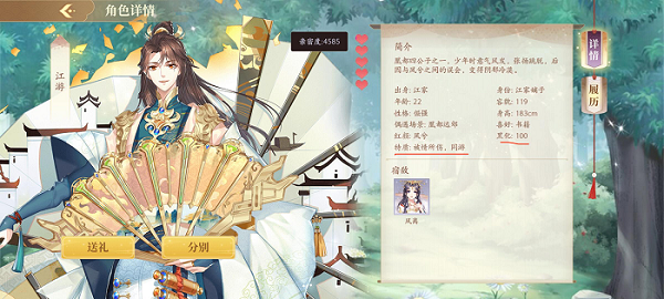 刷亲密度有三种方法,第一种最直接的送礼物,每个人对礼物的喜好不同,送TA喜欢的东西TA才会收,礼物一共四种三个等级,亲密度分别是加5、10、20送就完了。第二种是事件,像我刚才提到的,有些事件选项加亲密度,有些事件无论你怎么选都是扣亲密度的,甚至增加黑化值或者影响其他人角色特质(后面我会提到这两个东西)。第三种是初始亲密度在0及0以上的,可以在遇见TA的场景中点击角色详情,进行闲聊选项(这个亲密度每次加20,一天一次)。如果亲密度为负数,那么不要闲聊,别问我为什么,问就是黑化值加10,亲密度减40。