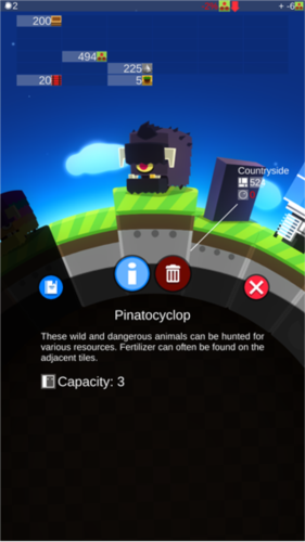 5、在我的星球游戏里点击一块没有建筑的地形后,会出现一个□和○,后面的数字分别代表固体矿产和液体矿产的数量,海被抽干后可以采集到大量石油。