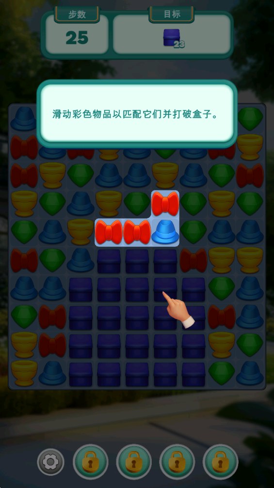 1.移动方块,将三个相同的方块放在一条线上就可以消除。
